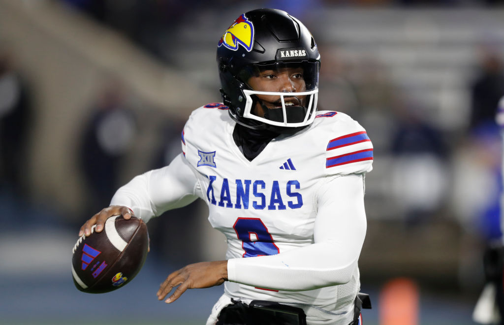 PROVO, UT – NOVEMBER 16: Jalon Daniels #6 of the Kansas Jayhawks throws a pass during warmups before their game against the Brigham Young Cougars at LaVell Edwards Stadium on November 16, 2024 in Provo, Utah.(Photo by Chris Gardner/Getty Images)