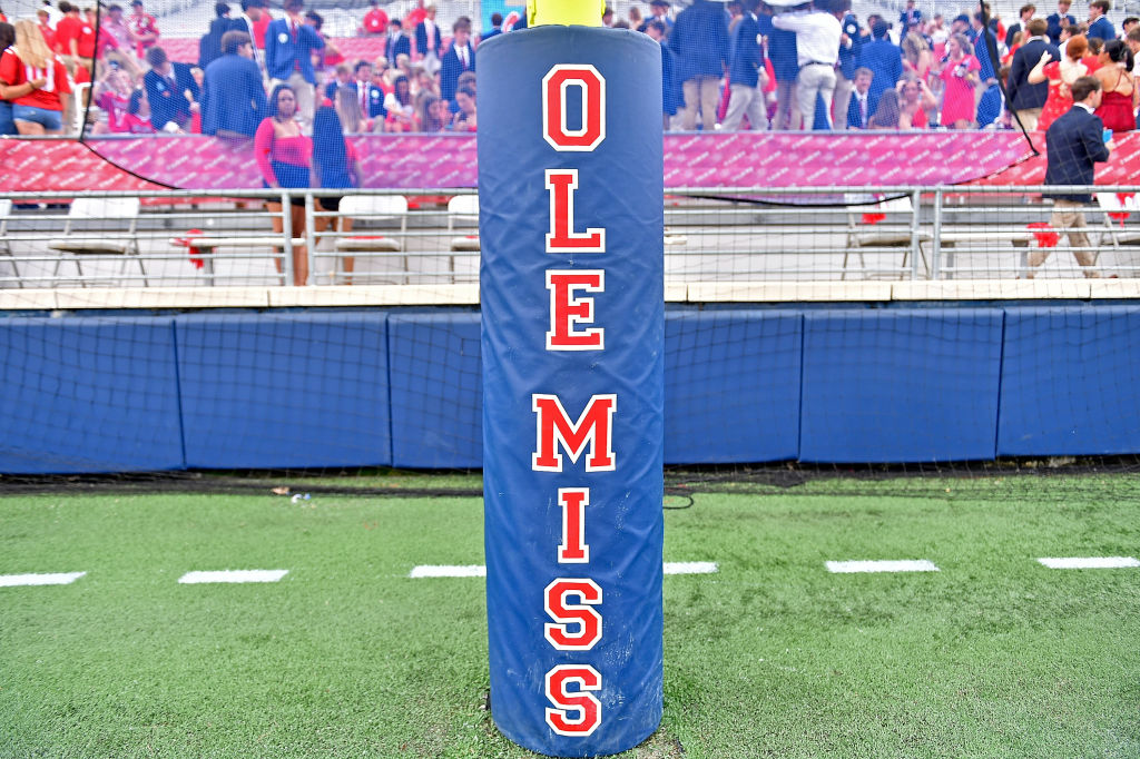 OXFORD, MISSISSIPPI – SEPTEMBER 10: Detailed photo of the ole miss logo before the game between the Mississippi Rebels and the Central Arkansas Bears at Vaught-Hemingway Stadium on September 10, 2022 in Oxford, Mississippi. (Photo by Justin Ford/Getty Images)
