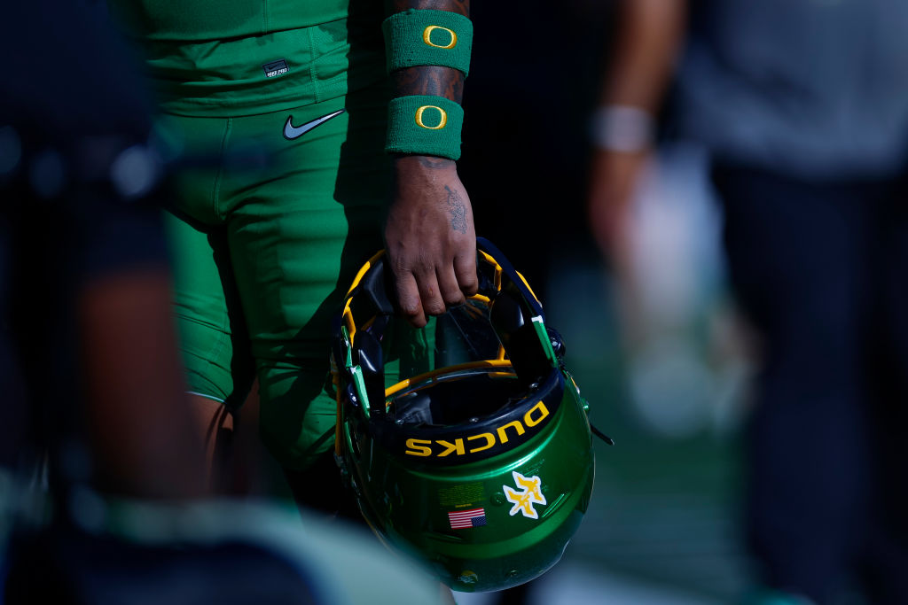 EUGENE, OREGON – AUGUST 31: Oregon Ducks logo stickers on a helmet during the first half against the Idaho Vandals at Autzen Stadium on August 31, 2024 in Eugene, Oregon. (Photo by Brandon Sloter/Image Of Sport/Getty Images)