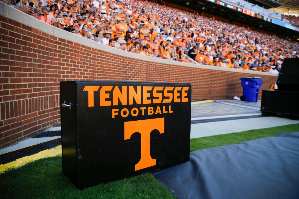 KNOXVILLE, TENNESSEE – AUGUST 31: A block with the Tennessee Volunteers logo on the sideline during the third quarter of the season opener at Neyland Stadium on August 31, 2019 in Knoxville, Tennessee. (Photo by Silas Walker/Getty Images)