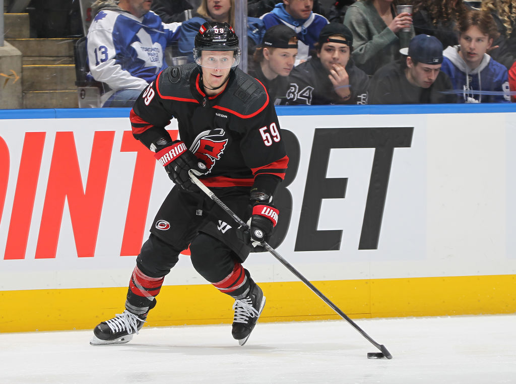 TORONTO, CANADA – MARCH 16: Jake Guentzel #59 of the Carolina Hurricanes skates with the puck against the Toronto Maple Leafs during the first period in an NHL game at Scotiabank Arena on March 16, 2024 in Toronto, Ontario, Canada. The Hurricanes defeated the Maple Leafs 5-4 in a shootout. (Photo by Claus Andersen/Getty Images)