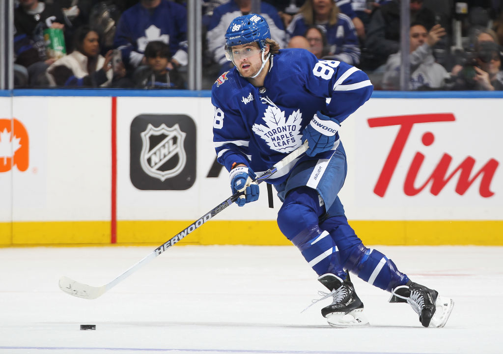 TORONTO, CANADA – JANUARY 13: William Nylander #88 of the Toronto Maple Leafs skates with the puck against the Colorado Avalanche during the second period in an NHL game at Scotiabank Arena on January 13, 2024 in Toronto, Ontario, Canada. The Avalanche defeated the Maple Leafs 5-3. (Photo by Claus Andersen/Getty Images)