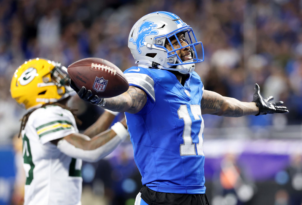 DETROIT, MICHIGAN – DECEMBER 05: Tim Patrick #17 of the Detroit Lions celebrates after scoring a 3 yard touchdown against the Green Bay Packers during the third quarter in the game at Ford Field on December 05, 2024 in Detroit, Michigan. (Photo by Gregory Shamus/Getty Images)