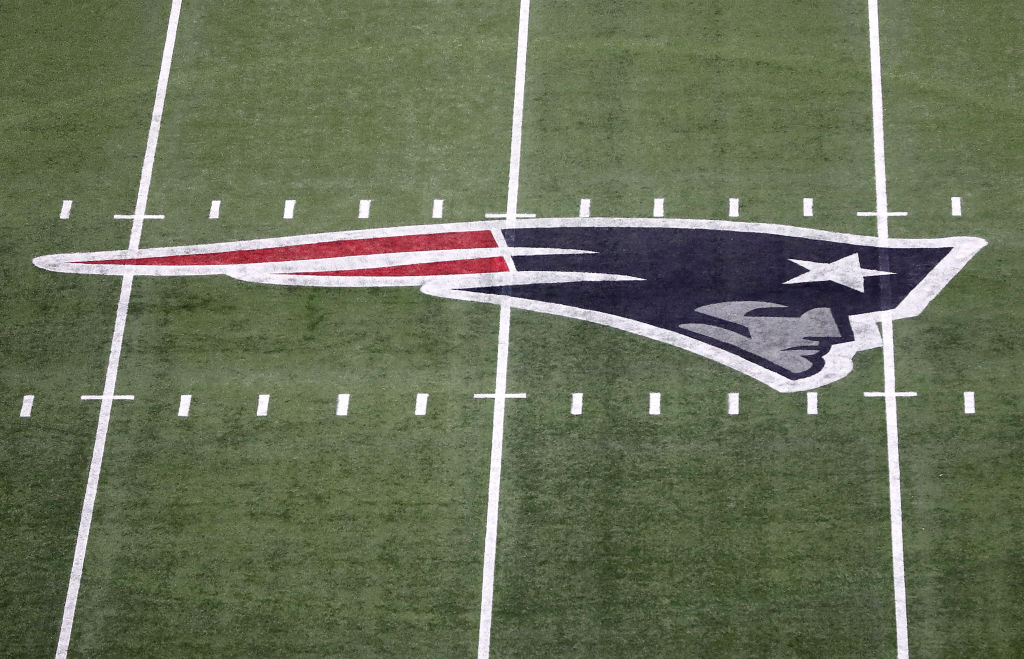 FOXBOROUGH, MASSACHUSETTS – SEPTEMBER 08: A detail of the New England Patriots logo on the field during the game between the New England Patriots and the Pittsburgh Steelers at Gillette Stadium on September 08, 2019 in Foxborough, Massachusetts. (Photo by Adam Glanzman/Getty Images)