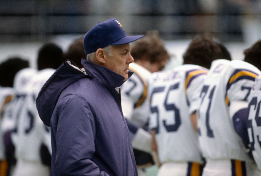 UNSPECIFIED – CIRCA 1977: Head Coach Bud Grant of the Minnesota Vikings stands with his team prior to the start of an NFL football game circa 1977. Grant was the head coach of the Vikings from 1967-83 and 1985. (Photo by Focus on Sport/Getty Images)