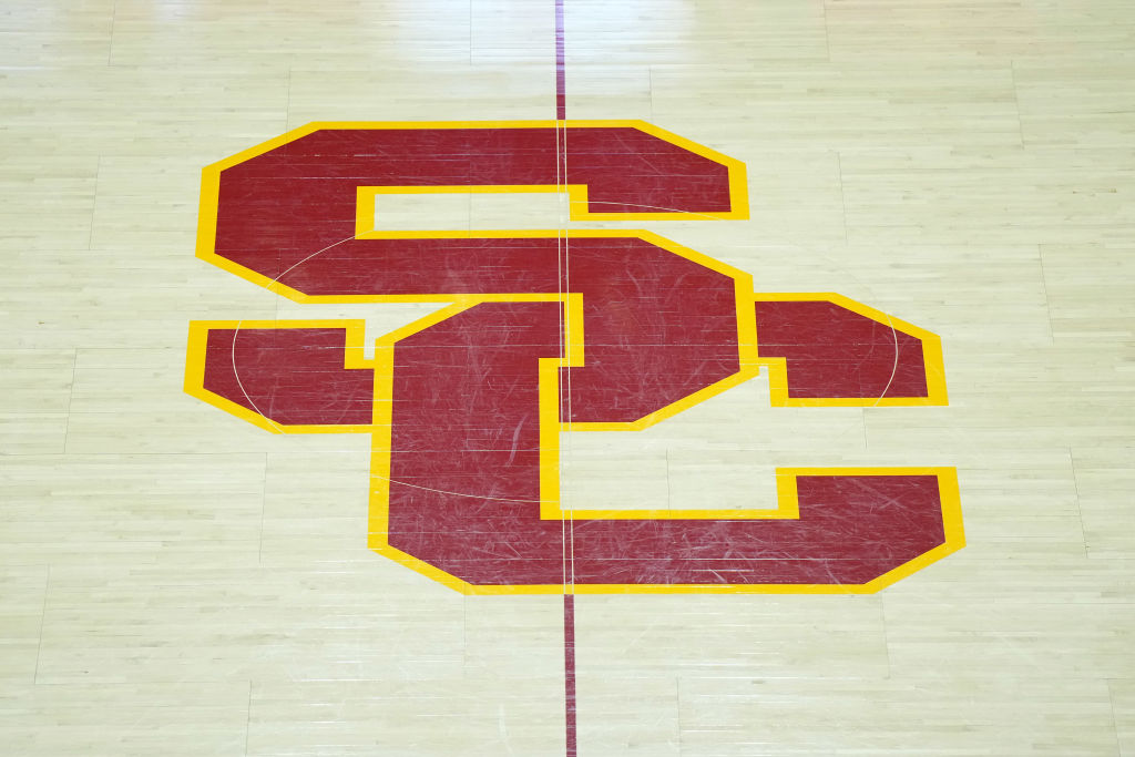 LOS ANGELES, CALIFORNIA – JANUARY 26: A general overall view of the Southern California Trojans SC logo at center court during an NCAA college women’s basketball game on January 26, 2024 at the Galen Center in Los Angeles. (Photo by Kirby Lee/Getty Images)