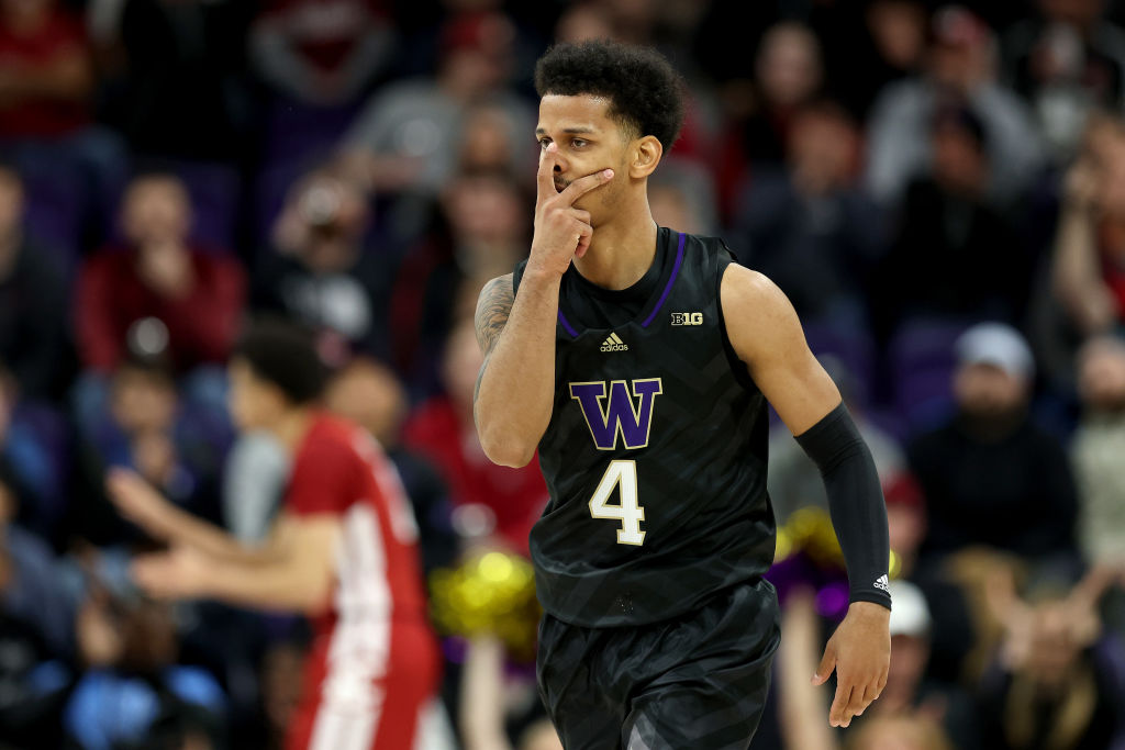 SEATTLE, WASHINGTON – DECEMBER 18: DJ Davis #4 of the Washington Huskies reacts after his three point basket against the Washington State Cougars at Alaska Airlines Arena on December 18, 2024 in Seattle, Washington. (Photo by Steph Chambers/Getty Images)