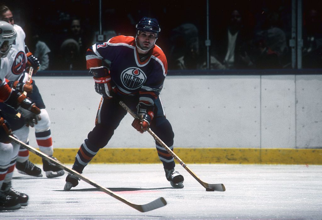 Canadian hockey player Paul Coffey of the Edmonton Oilers in action against the New York islanders at Nassau Coliseum, Uniondale, New York, February 7, 1984. (Photo by Bruce Bennett Studios via Getty Images Studios/Getty Images)