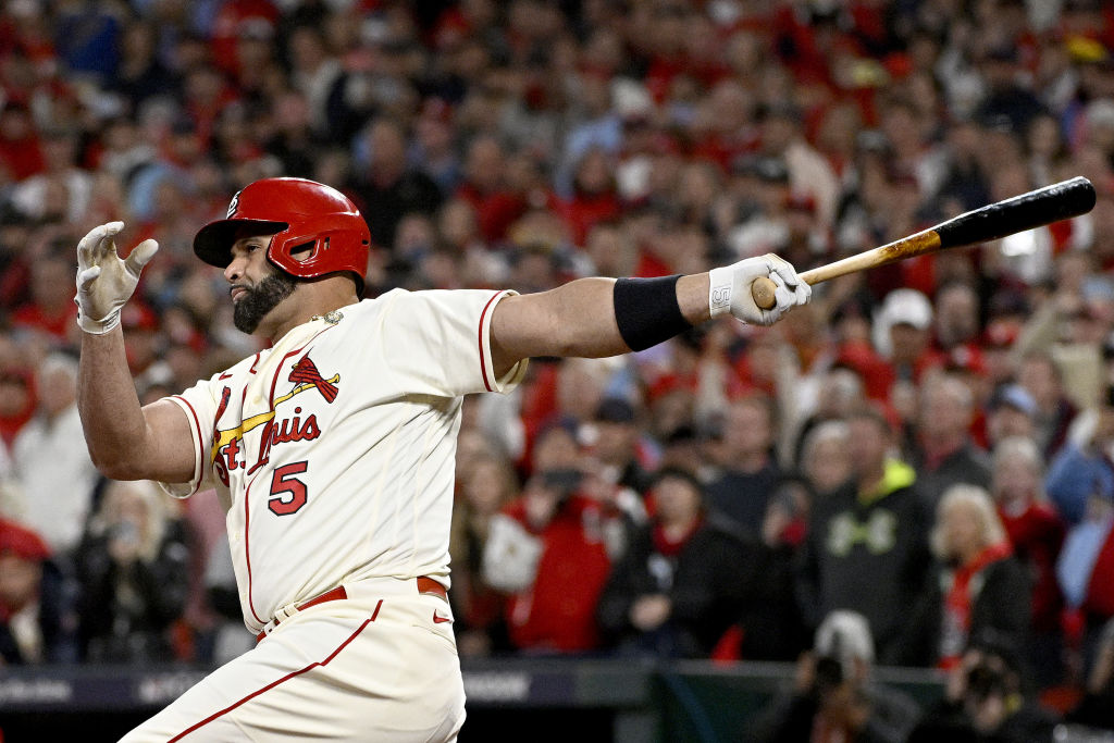 ST LOUIS, MISSOURI – OCTOBER 08: Albert Pujols #5 of the St. Louis Cardinals hits a single to left field against the Philadelphia Phillies during the eighth inning in game two of the National League Wild Card Series at Busch Stadium on October 08, 2022 in St Louis, Missouri. (Photo by Joe Puetz/Getty Images)