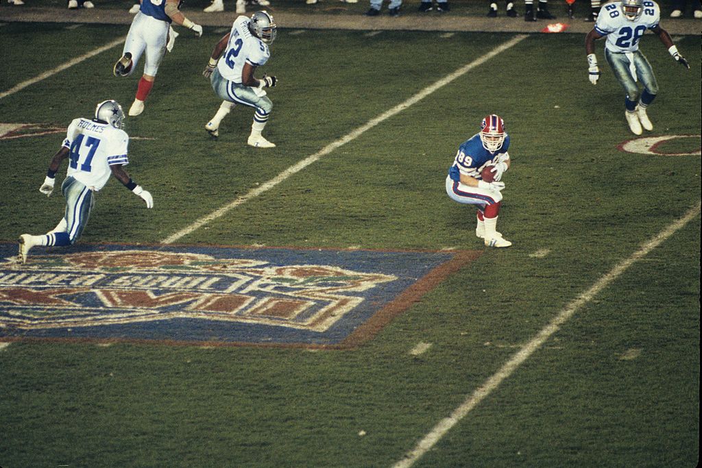 PASADENA, CA – JANUARY 31: Wide receiver Steve Tasker #89 of the Buffalo Bills catches a pass against the Dallas Cowboys in Super Bowl XXVII at the Rose Bowl on January 31, 1993 in Pasadena, California. The Cowboys defeated the Bills 52-17. (Photo by Gin Ellis/Getty Images)