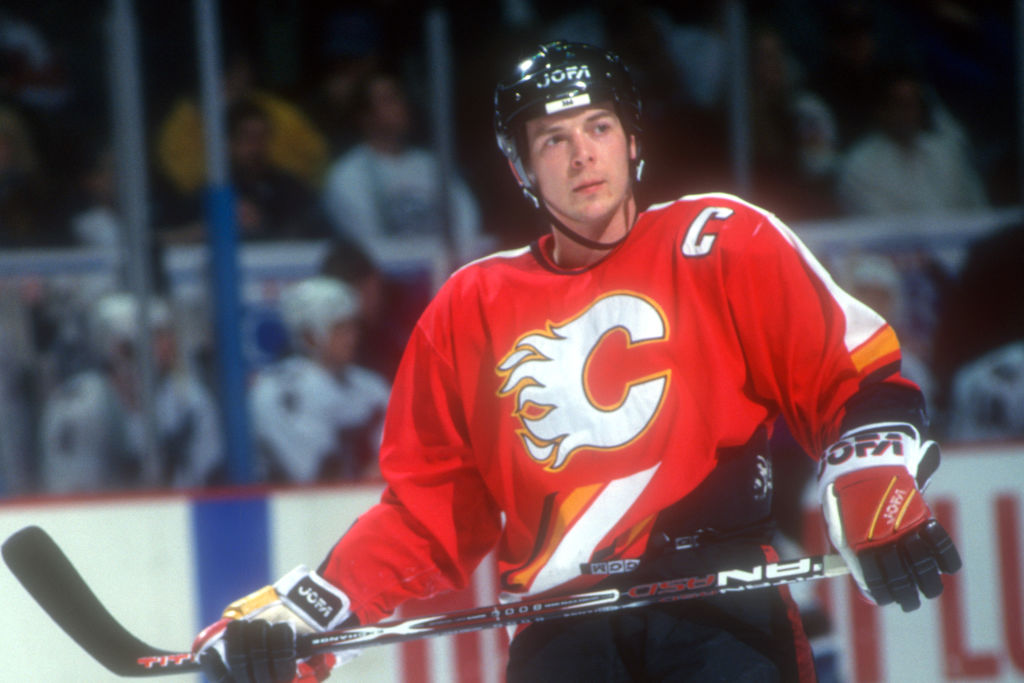 LANDOVER, MD – FEBRUARY 13: Theo Fleury #12 of the Calgary Flames iooks on during a NHL hockey game against the Washington Capitals on January 13, 1996 at the USAir Arena in Landover, Maryland. (Photo by Mitchell Layton/Getty Images)