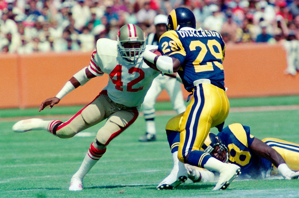 ANAHEIM, CALIFORNIA – SEPTEMBER 14 : Los Angeles Rams Eric Dickerson runs against San Francisco 49’ers Ronnie Lott (42) during Los Angeles Rams against San Francisco 49’ers game, September 14, 1986 in Anaheim, California. (Photo by Bob Riha, Jr./Getty Images)