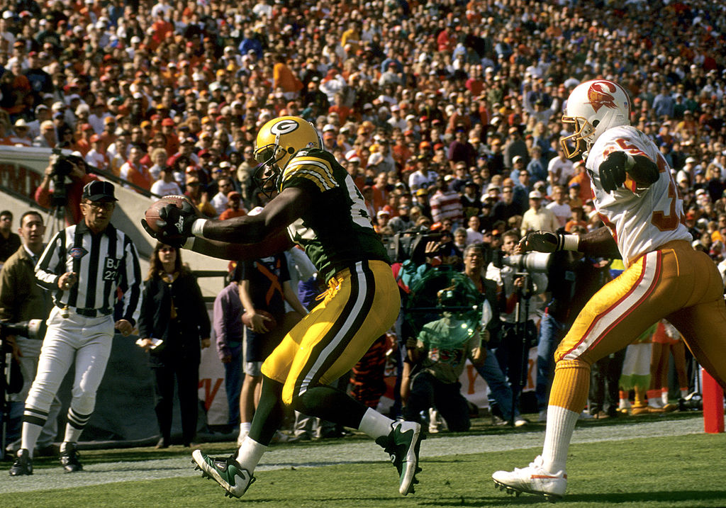 Green Bay Packers wide receiver Sterling Sharpe (84) catches a six-yard touchdown pass–one of three TDs Sharpe had for the game–during a 34-19 victory over the Tampa Bay Buccaneers on December 24, 1994, at Houlihan’s Stadium in Tampa, Florida. (Photo by James V. Biever/Getty Images)