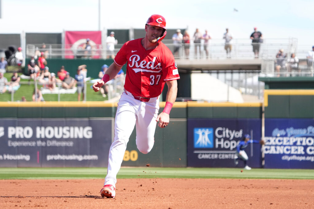 Feb 24, 2025; Goodyear, Arizona, USA; Cincinnati Reds catcher Tyler Stephenson (37) runs the bases against the Los Angeles Dodgers during the first inning at Goodyear Ballpark. Mandatory Credit: Joe Camporeale-Imagn Images