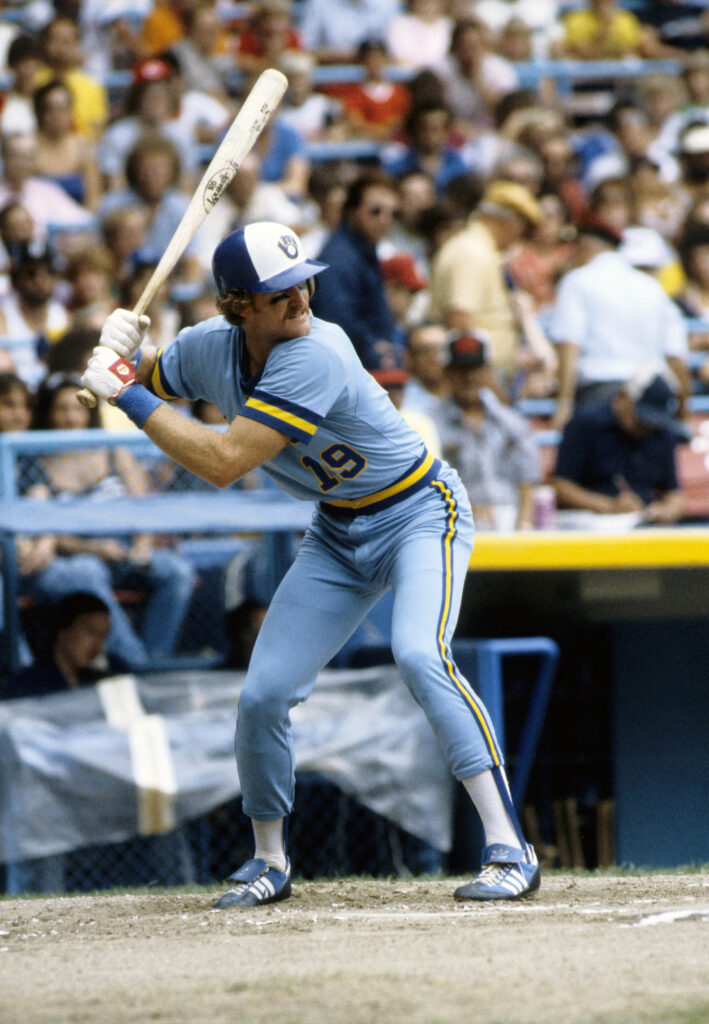 Aug 1982; Cleveland, OH, USA; FILE PHOTO; Milwaukee Brewers shortstop Robin Yount (19) at bat against the Cleveland Indians during the 1982 season at Cleveland Stadium. Mandatory Credit: Malcolm Emmons-USA TODAY Sports
