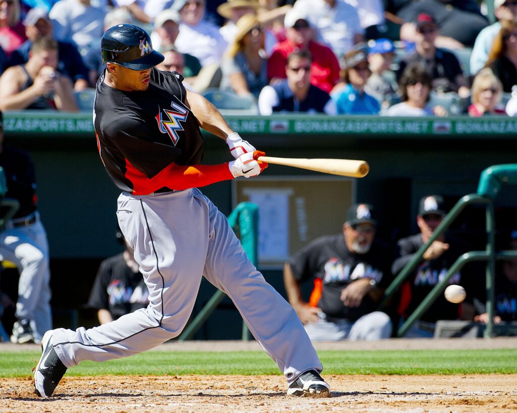 Mar 5, 2012; Jupiter, FL. USA; Miami Marlins right fielder Giancarlo Stanton (27) connects for a base hit against the St. Louis Cardinals at Roger Dean Stadium. The Marlins defeated the Cardinals 4-3. Mandatory Credit: Scott Rovak-USA TODAY Sports