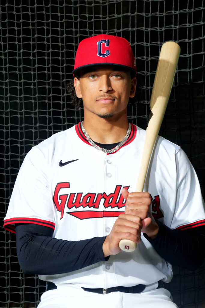 Feb 20, 2025; Goodyear, AZ, USA; Cleveland Guardians catcher Bo Naylor (23) poses for a photo during MLB Media Day at Cleveland Guardians Spring Training Facility. Mandatory Credit: Joe Camporeale-Imagn Images