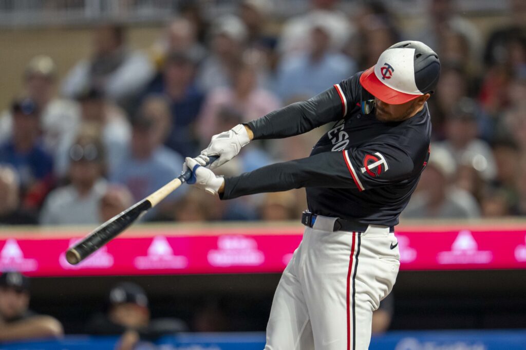 Sep 25, 2024; Minneapolis, Minnesota, USA; Minnesota Twins right fielder Trevor Larnach (9) hits a two-run single against the Miami Marlins in the third inning at Target Field. Mandatory Credit: Jesse Johnson-Imagn Images