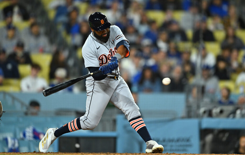 Mar 29, 2025; Los Angeles, California, USA; Detroit Tigers outfielder Manuel Margot (7) singles in the ninth against the Los Angeles Dodgers at Dodger Stadium. Mandatory Credit: Jonathan Hui-Imagn Images