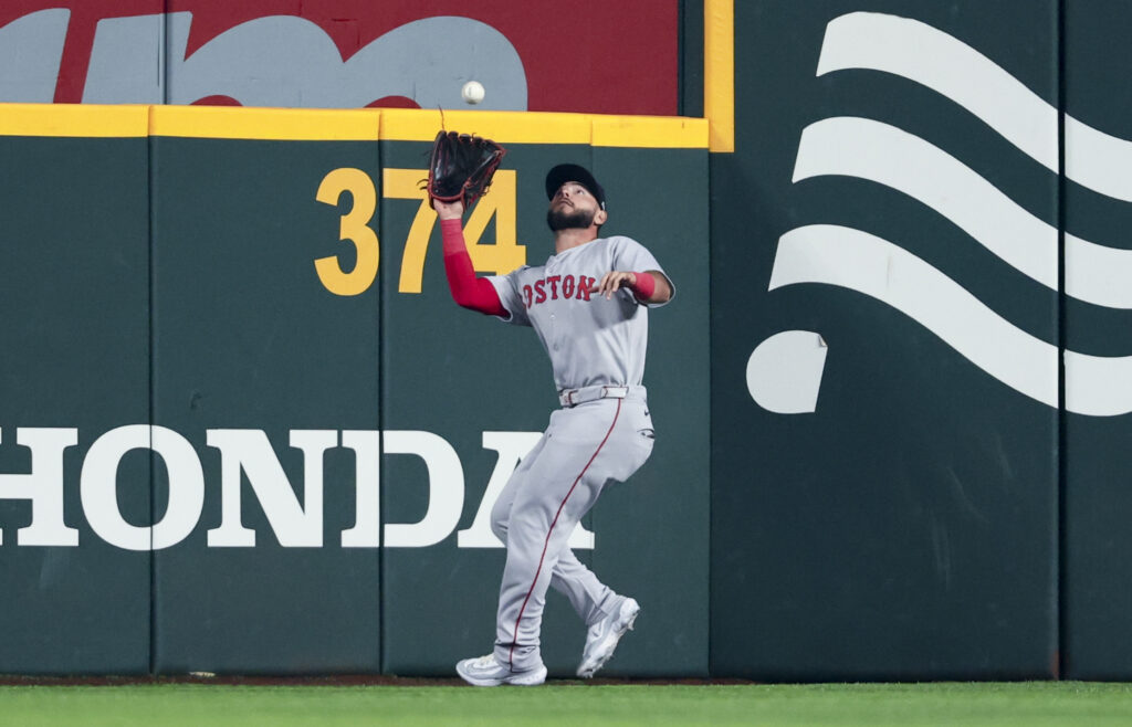 Mar 30, 2025; Arlington, Texas, USA; Boston Red Sox right fielder Wilyer Abreu (52) makes a catch during the first inning against the Texas Rangers at Globe Life Field. Mandatory Credit: Kevin Jairaj-Imagn Images