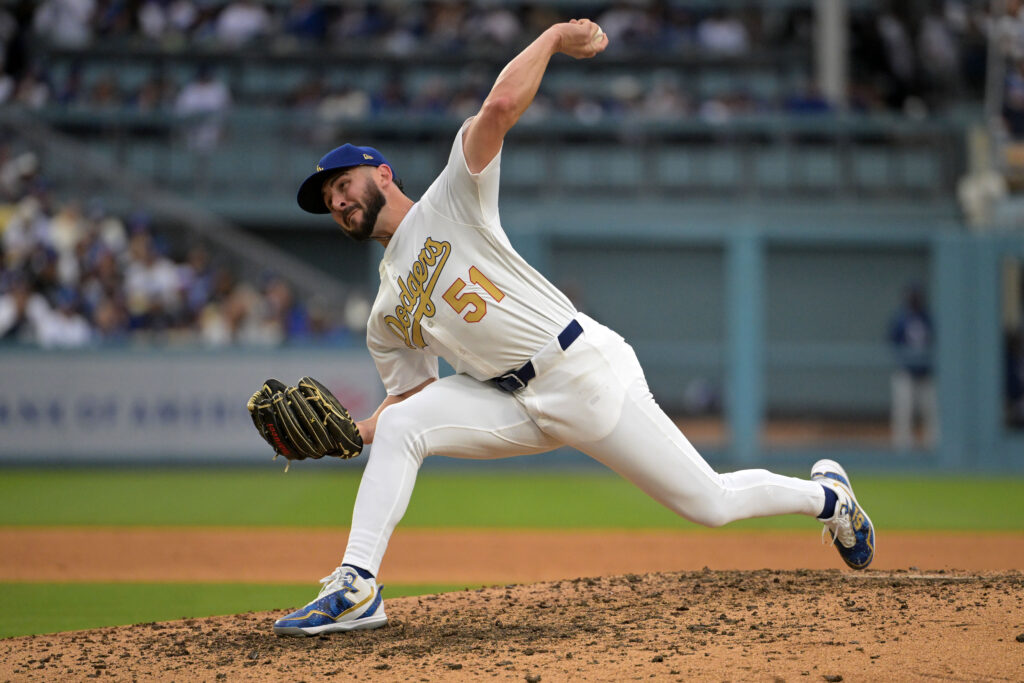 Mar 27, 2025; Los Angeles, California, USA; Los Angeles Dodgers pitcher Alex Vesia (51) throws a pitch against the Detroit Tigers during the seventh inning at Dodger Stadium. Mandatory Credit: Jayne Kamin-Oncea-Imagn Images