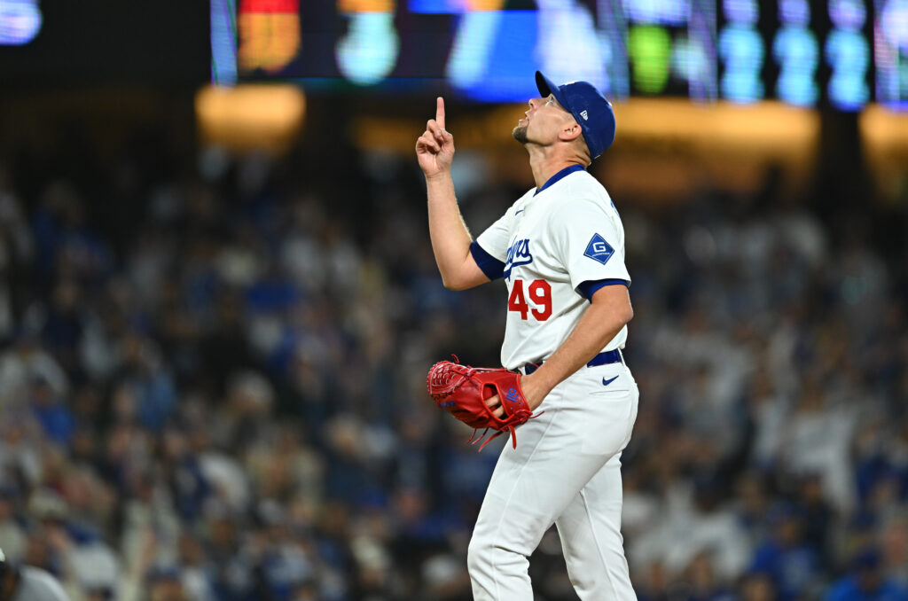Mar 29, 2025; Los Angeles, California, USA; Los Angeles Dodgers pitcher Blake Treinen (49) reacts after defeating the Detroit Tigers at Dodger Stadium. Mandatory Credit: Jonathan Hui-Imagn Images