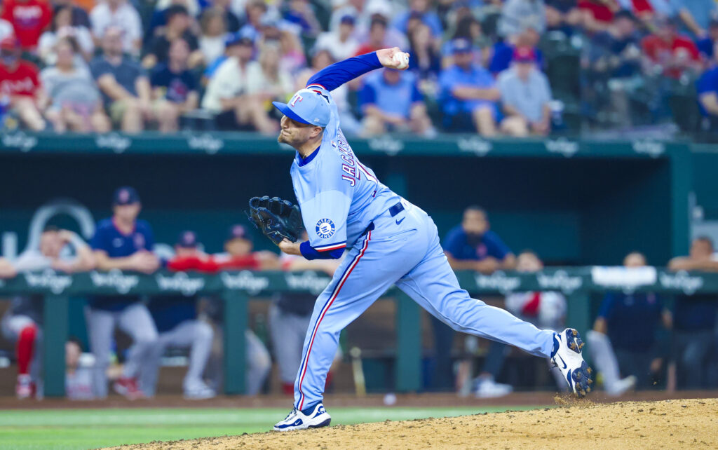 Mar 30, 2025; Arlington, Texas, USA; Texas Rangers relief pitcher Luke Jackson (77) throws during the ninth inning against the Boston Red Sox at Globe Life Field. Mandatory Credit: Kevin Jairaj-Imagn Images