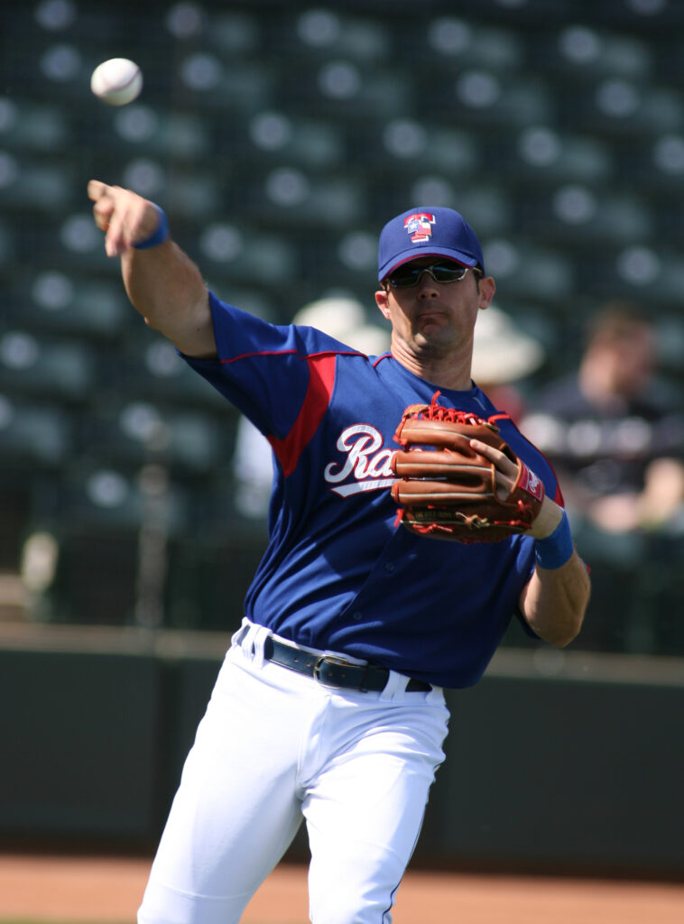 Mar 2, 2006; Surprise, AZ, USA; Texas Rangers shortstop (10) Michael Young throws to first against the Kansas City Royals at Surprise Stadium. Mandatory Credit: Rick Scuteri-USA TODAY Sports Copyright Rick Scuteri