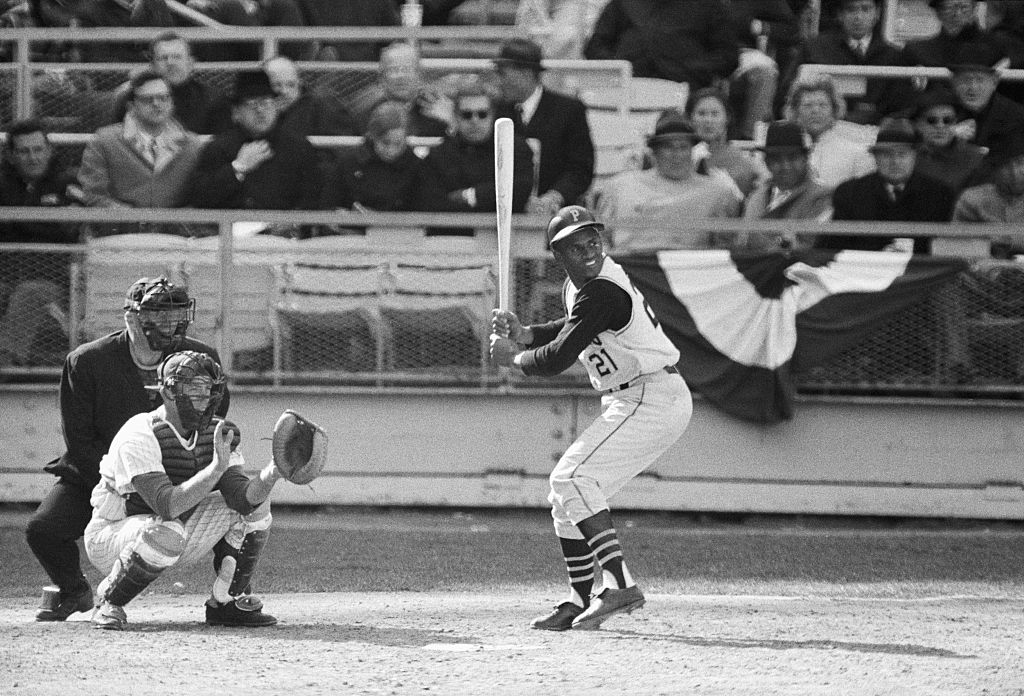 (Original Caption) 4/13/1967-New York, NY: Roberto Clemente of the Pittsburgh Pirates, batting during a game in Shea Stadium against the Mets.