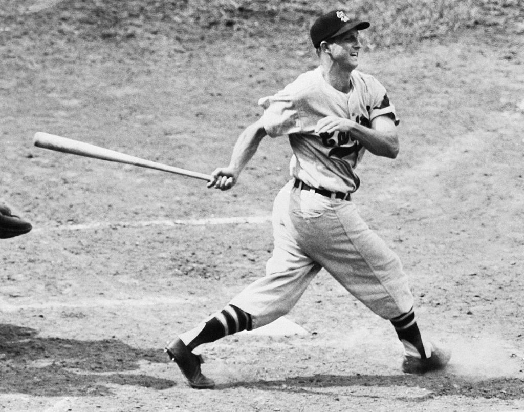 (Original Caption) 8/12/1956-Chicago, IL- Stan Musial, of the Cardinals, slaps out his 1,071st extra base-hit to tie a National League Record held by Mel Ott, former Giants great. Musial’s blow, a double, came in the 6th inning of the first game against the Chicago Cubs. The pitcher at the time was Bob Rush. The Cubs won, 6-2.