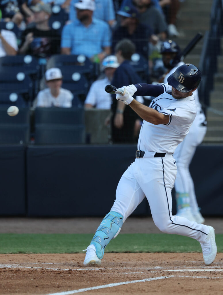 Mar 28, 2025; Tampa, Florida, USA; Tampa Bay Rays second base Brandon Lowe (8) singles during the seventh inning against the Colorado Rockies at George M. Steinbrenner Field. Mandatory Credit: Kim Klement Neitzel-Imagn Images
