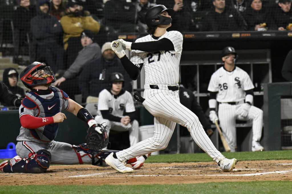Apr 1, 2025; Chicago, Illinois, USA; Chicago White Sox shortstop Brooks Baldwin (27) hits a sacrifice fly RBI during the fourth inning against the Minnesota Twins at Guaranteed Rate Field. Mandatory Credit: Matt Marton-Imagn Images