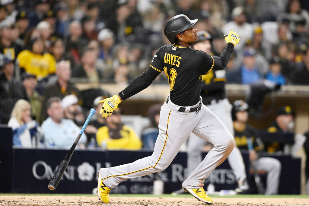 SAN DIEGO, CA – MAY 28: Ke’Bryan Hayes #13 of the Pittsburgh Pirates hits a three-run home run during the ninth inning of a baseball game against the San Diego Padres at Petco Park on May 28, 2022 in San Diego, California. (Photo by Denis Poroy/Getty Images)