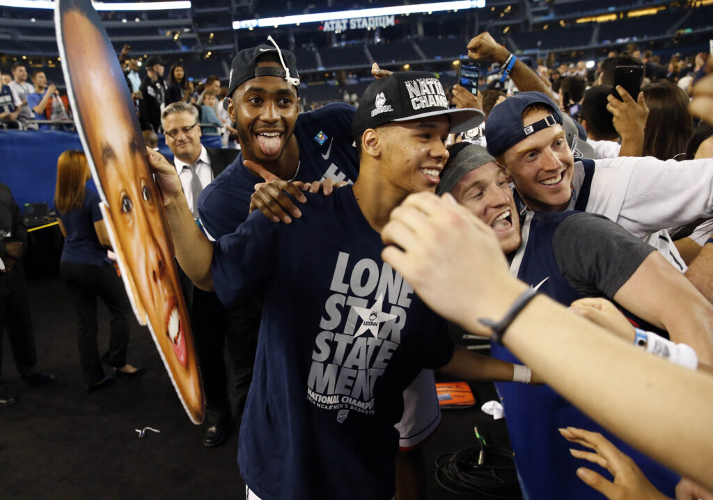 Apr 7, 2014; Arlington, TX, USA; Connecticut Huskies guard Shabazz Napier (13) and forward DeAndre Daniels (2) celebrate with fans after beating the Kentucky Wildcats during the championship game of the Final Four in the 2014 NCAA Mens Division I Championship tournament at AT&T Stadium. Mandatory Credit: Kevin Jairaj-USA TODAY Sports