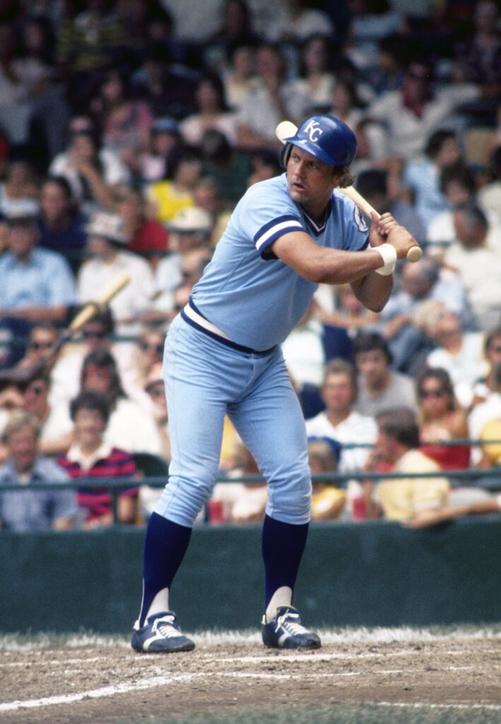 July 1976; Detroit, MD, USA; FILE PHOTO; Kansas City Royals third baseman George Brett (5) at bat against the Baltimore Orioles at Tiger Stadium. Mandatory Credit: Malcolm Emmons-USA TODAY Sports