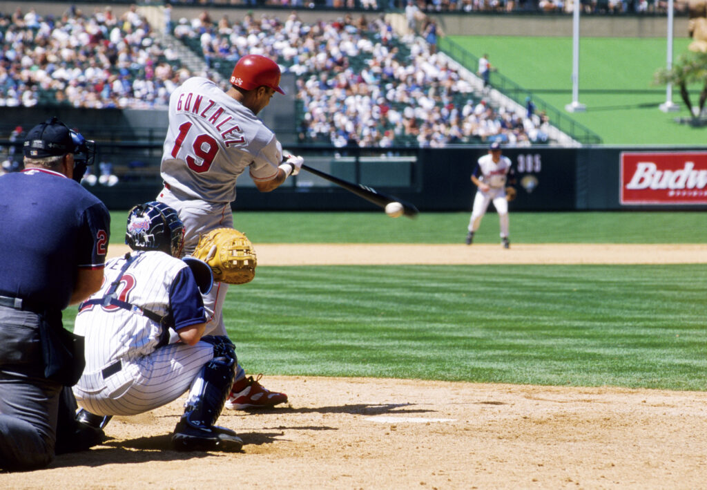 1998, Anaheim, CA, USA; FILE PHOTO; Texas Rangers left fielder Juan Gonzalez in action at the plate against the Anaheim Angels at Angels Stadium during the 1998 season. Mandatory Credit: RVR Photos-USA TODAY Sports