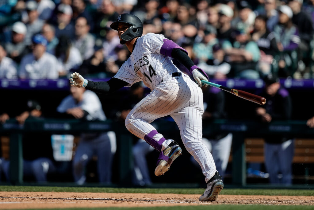 Apr 6, 2025; Denver, Colorado, USA; Colorado Rockies shortstop Ezequiel Tovar (14) watches his ball on a two RBI single in the eighth inning against the Athletics at Coors Field. Mandatory Credit: Isaiah J. Downing-Imagn Images