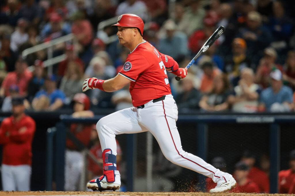 Mar 7, 2025; West Palm Beach, Florida, USA; Washington Nationals first baseman Nathaniel Lowe (33) hits a single against the New York Mets during the third inning at CACTI Park of the Palm Beaches. Mandatory Credit: Sam Navarro-Imagn Images