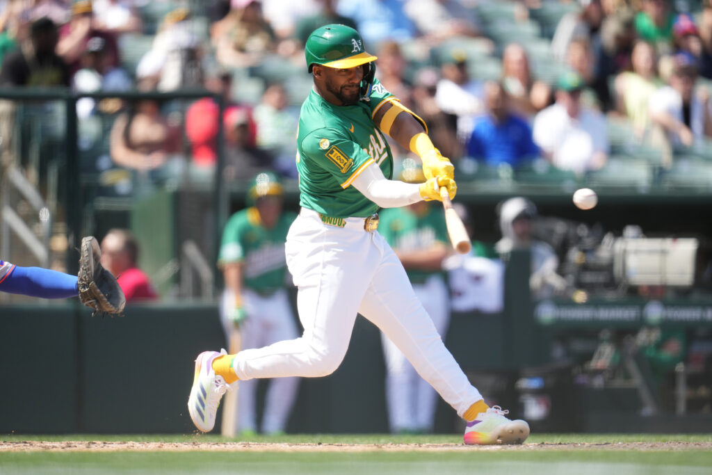 Apr 12, 2025; West Sacramento, California, USA; Athletics left fielder Miguel Andujar (22) hits a single against the New York Mets in the fourth inning at Sutter Health Park. Mandatory Credit: Cary Edmondson-Imagn Images