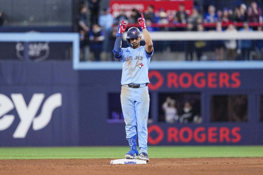 Mar 31, 2025; Toronto, Ontario, CAN; Toronto Blue Jays second baseman Andres Gimenez (0) celebrates after hitting a double against the Washington Nationals during the eighth inning at Rogers Centre. Mandatory Credit: Kevin Sousa-Imagn Images