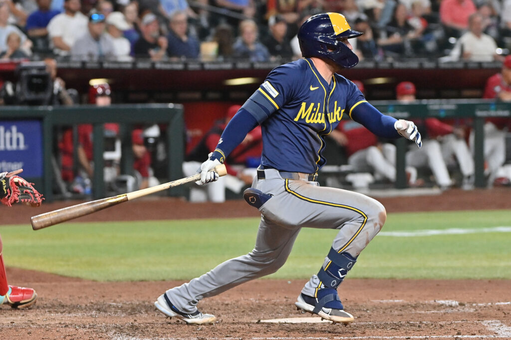 Apr 11, 2025; Phoenix, Arizona, USA; Milwaukee Brewers second base Brice Turang (2) hits a two RBI double in the ninth inning against the Arizona Diamondbacks at Chase Field. Mandatory Credit: Matt Kartozian-Imagn Images