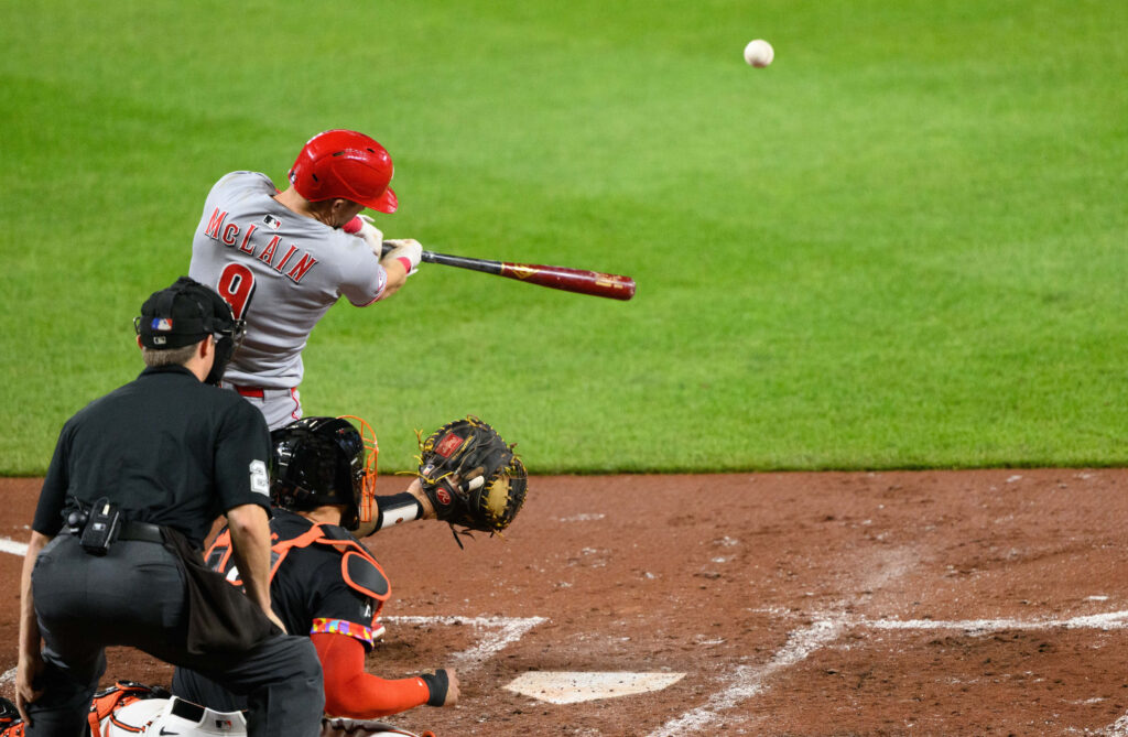 Apr 18, 2025; Baltimore, Maryland, USA; Cincinnati Reds second baseman Matt McLain (9) hits a home run during the fourth inning against the Baltimore Orioles at Oriole Park at Camden Yards. Mandatory Credit: Reggie Hildred-Imagn Images