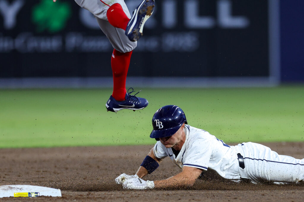Apr 14, 2025; Tampa, Florida, USA; Tampa Bay Rays right fielder Jake Mangum (28) steals second base against the Boston Red Sox in the third inning at George M. Steinbrenner Field. Mandatory Credit: Nathan Ray Seebeck-Imagn Images