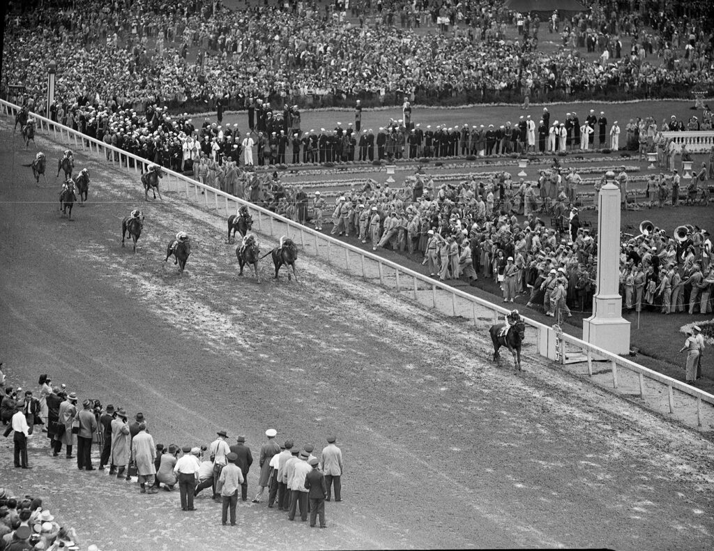June 9, 1945; Louisville, KY, USA; Hoop Jr. with jockey Eddie Arcaro aboard crushes his opponents in the Kentucky Derby at Churchill Downs. Mandatory Credit: Bernie Metzroth/The Courier Journal via USA TODAY NETWORK
