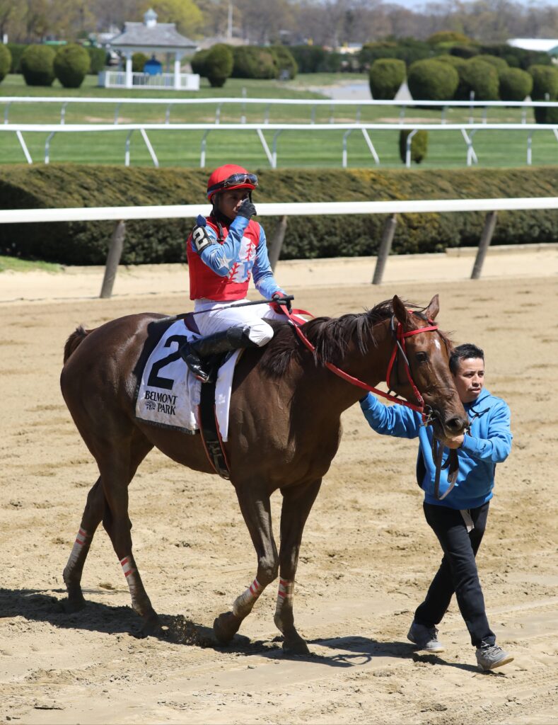 Three year old filly Ivory and Ebony, with jockey Irad Ortiz, Jr. up, is led from to the track after finishing second in race 5 at Keenland in Lexington, Kentucky on Monday, April 7.