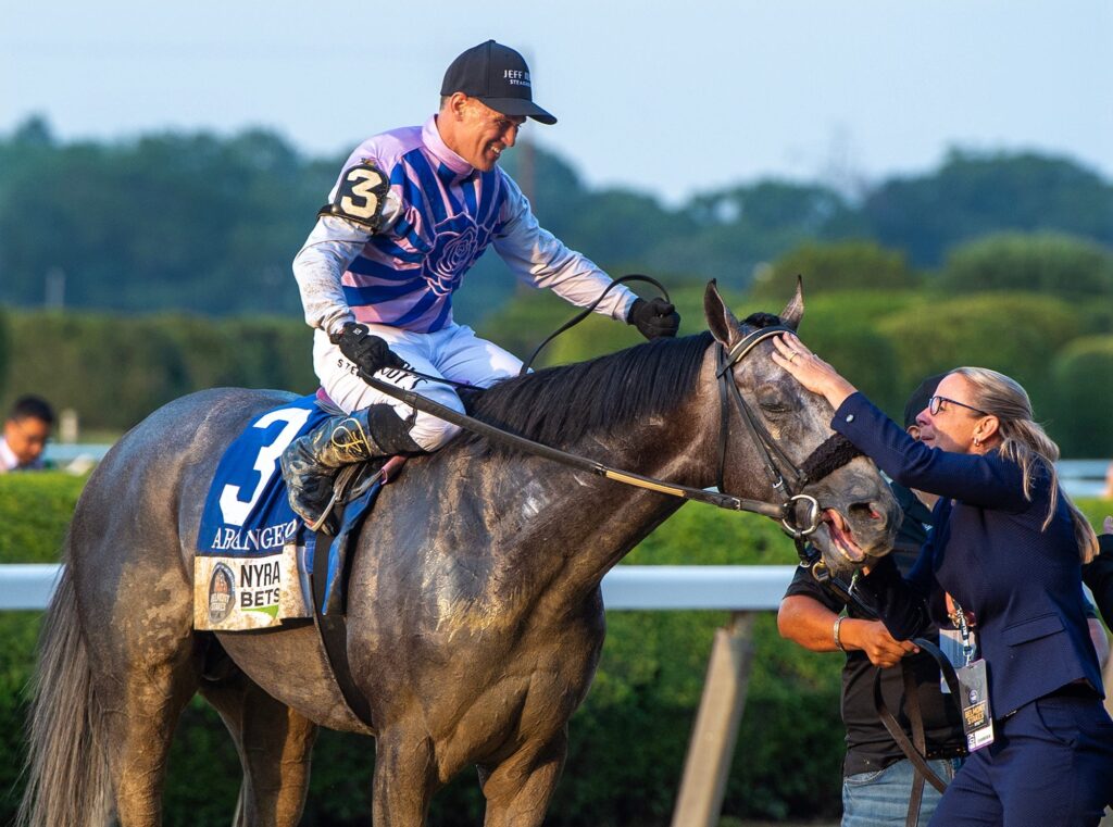 The $1,500,000 Belmont Stakes presented by NYRA Bets, (GR 1), for three year-olds going one and a half miles over the dirt Saturday, June 10, 2023, was won by Blue Rose Farm’s Arcangelo, with jockey Javier Castellano, as trainer, Jena Antonucci pats her trainee on the forehead.