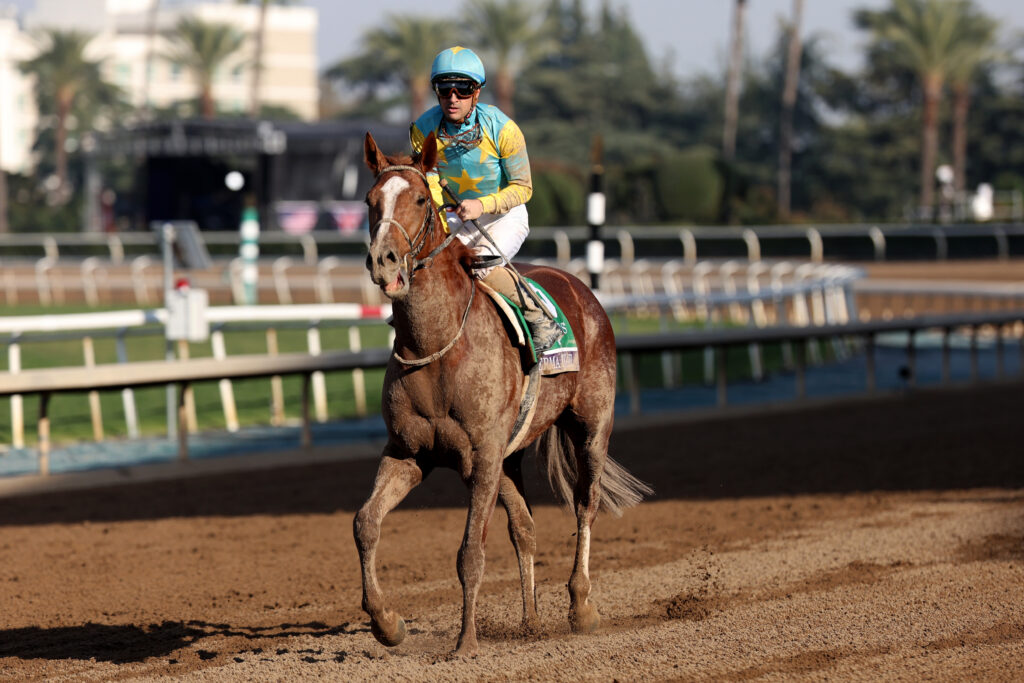 Nov 4, 2023; Santa Anita, CA, USA; DERMA SOTOGAKE (5), with jockey Christophe Lemaire up, reacts after the BREEDERS CUP CLASSIC race during the 2023 Breeders Cup World Championships at Santa Anita Park. Mandatory Credit: Kiyoshi Mio-USA TODAY Sports