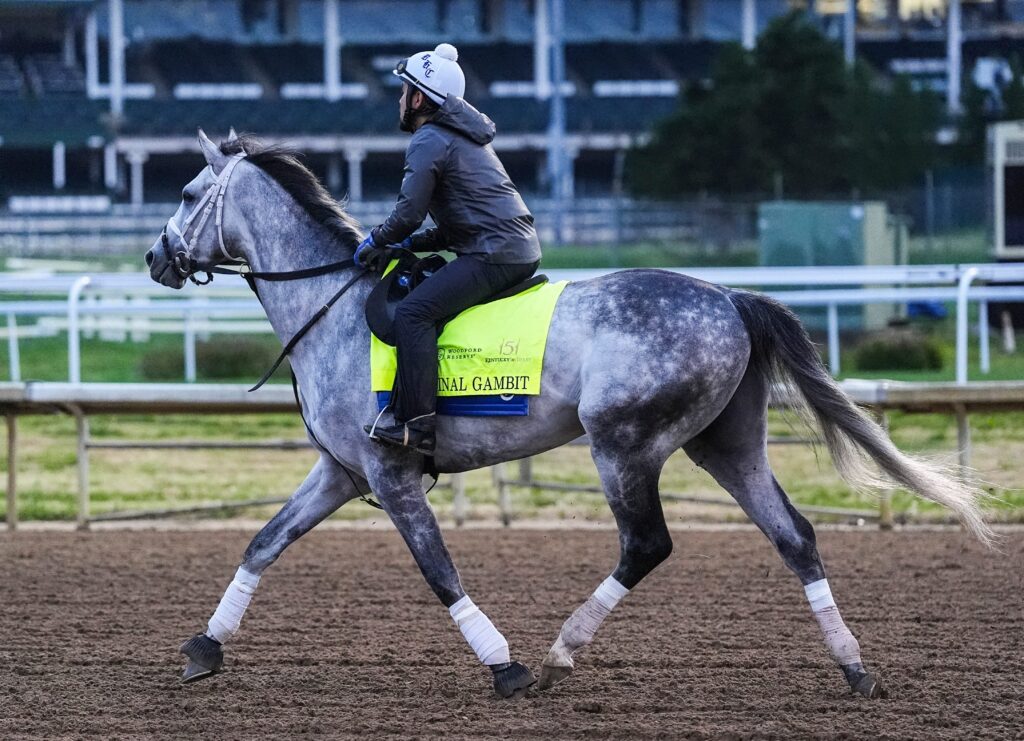 Kentucky Derby 151 contender Final Gambit takes to the track for a workout at Churchill Downs in Louisville, Kentucky on Monday, April 21, 2025. Trainer is Brad Cox. Jockey slated to ride is Luan Machado, his first Kentucky Derby. Horse has earned $520,639 in four starts; winning the Grade 3 Jeff Ruby Steaks on March 22 by 3 1/2 lengths over Flying Mohawk.