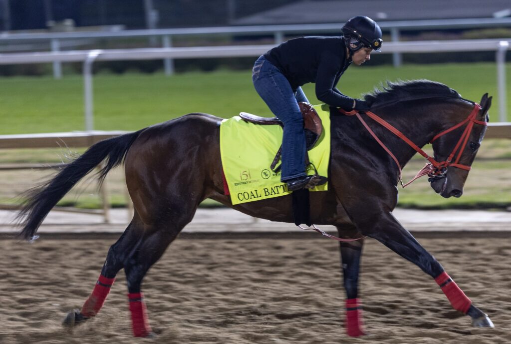 Kentucky Derby contender Coal Battle, gallops in the morning at Churchill Downs. Coal Battle is trained by Lonnie Briley. Photo by Pat McDonogh. April 18, 2025