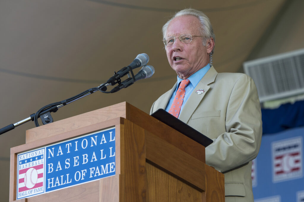 Jul 26, 2015; Cooperstown, NY, USA; Master of Ceremonies, Balitmore Orioles broadcaster Gary Thorne makes Hall of Fame player introductions during the Hall of Fame Induction Ceremonies at Clark Sports Center. Mandatory Credit: Gregory J. Fisher-USA TODAY Sports